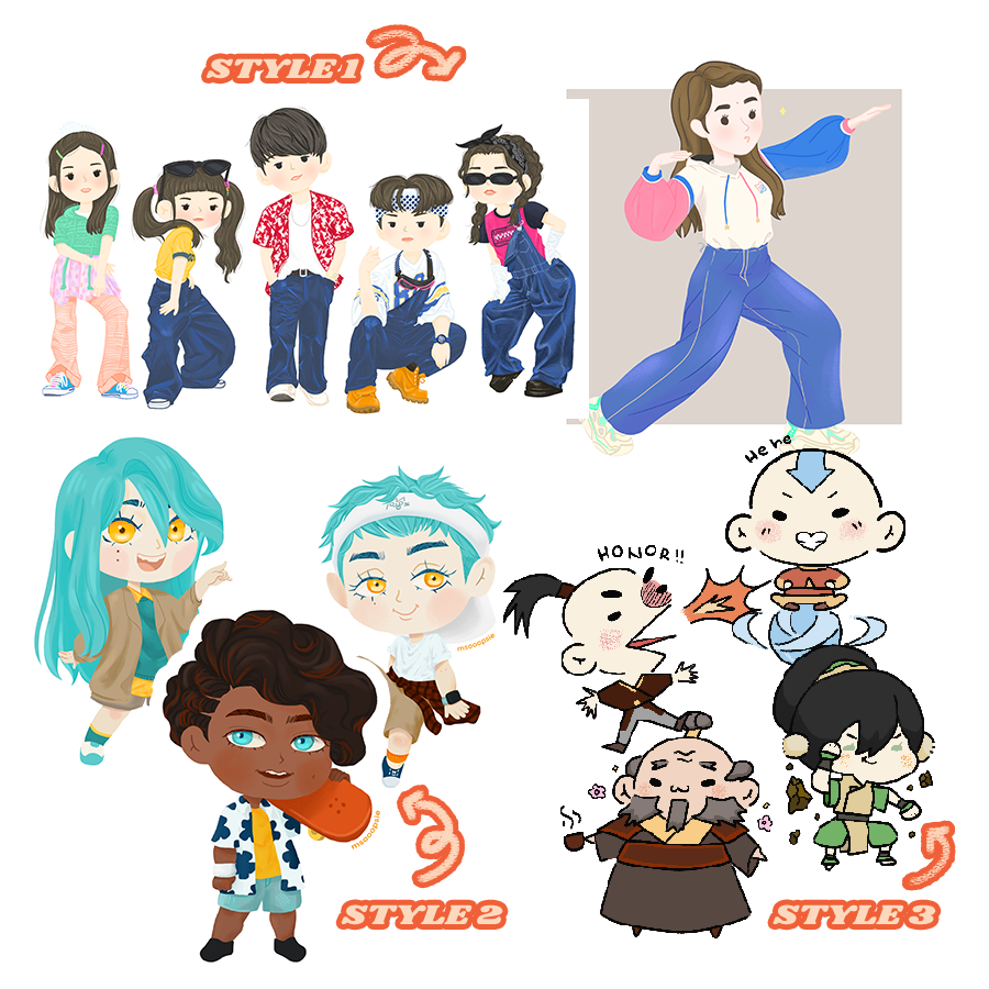 - Style 1: Chibi with semi-realistic clothing. Style 2 and 3: Chibi style